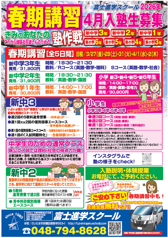 富士進学スクールでは4月新年度入塾生のお受け入れをしています。